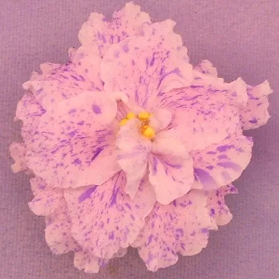 Double white to cream pink with blue fantasy speckling. Medium green, standard, foliage.