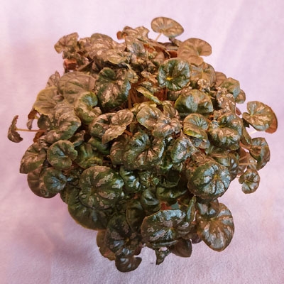 Small variety with glossy, round, olive colored leaves that spot with silver as it ages.