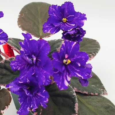 Semidouble dark blue frilled pansy with pink and white fantasy. Medium green, white and pink, TL variegated foliage. Standard. (Thibodeaux)