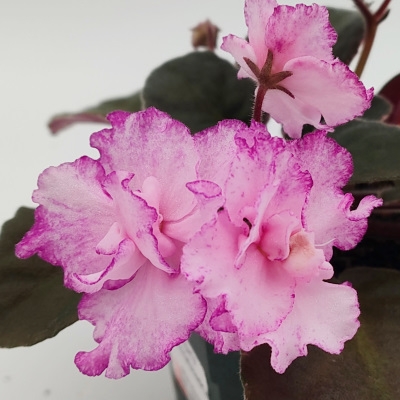 Semidouble to double frilled pink pansies with variable raspbarry speckled edging. Medium green and white TL variegated foliage. Standard. AVSA #10582 (Thibodeaux)