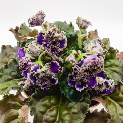 Semidouble to double bright purple star with frilled green edges.  Medium green, quilted, ruffled, foliage.  Standard.  AVSA #10495 (Thibodeaux)