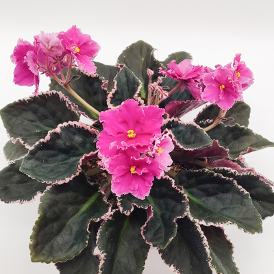 EK Lady Love was initially one of my slower growing violets, but it took off a few months ago. The flowers are a bit deeper in color for me than the photo here.. a rich, deep fuchsia. They are also pretty large, with a large number of buds to a peduncle, and the contrast with the bright yellow stamens is quite striking. The deep green foliage with a thin variegation on the edge is quite elegant as well. It is one of my favorite AVs.