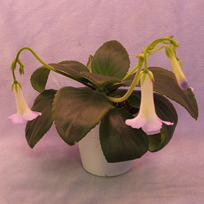 Large deep purple blooms on short flower spikes above medium green, pointed, hairy leaves in rosette form.