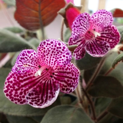 Dark maroon spots and streaks on white face. Medium-dark green, pointed foliage (Huang) To view image, go to: http://www.dollyyeh.idv.tw/Kohleria_HCYs_Rainbow_Ribbon.jpg