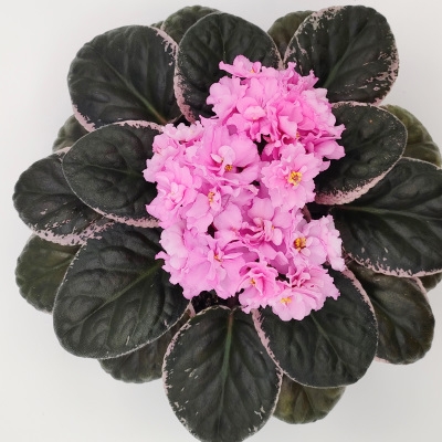 Semidouble to double medium dark pink frilled star. Dark green and cream TL variegated, serrated, foliage. Standard. AVSA #11216 (Muzalewski)