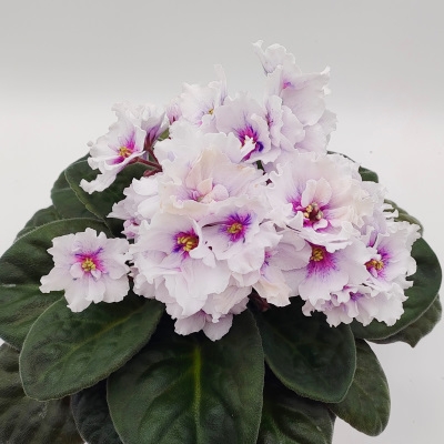 Large double white stars with reddish-purple eye, variably spotted blue. Dark green, quilted foliage. Very showy plant! Standard. (Hajner)