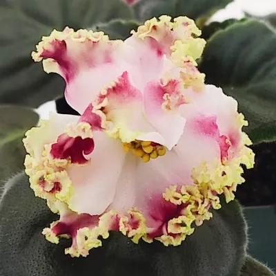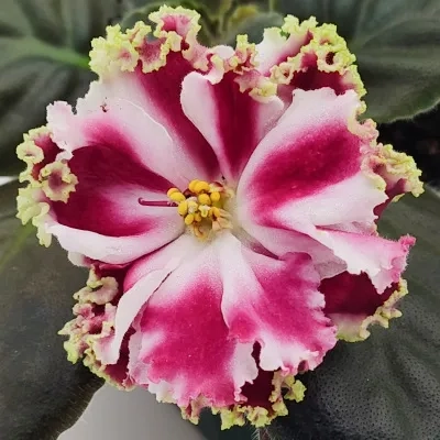 (KO Petushok Zolotoi Grebeshok) Beautiful, large, ruffled semidouble white and red blooms with variable fringed green edging. Medium green, serrated, standard foliage (Kosobokova) Note: variable bloom colors--will be darker when grown warmer, lighter when grown cooler.