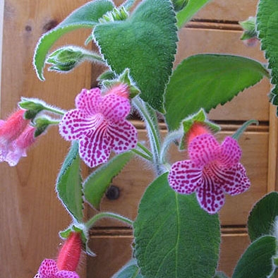 Large white blooms streaked with large dots or reddish-purple, fuzzy pinkish-purple backs. Very soft, medium green foliage. Showy blooms on a taller grower.