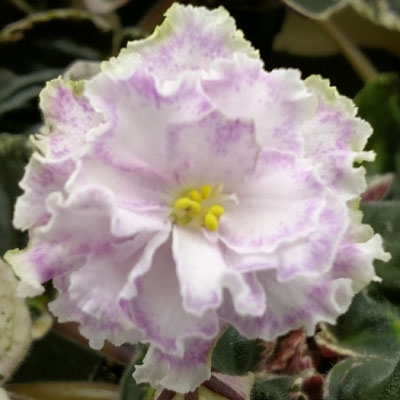 (LE Oliviia) Large, fully double white to sivlery-pink stars with frosted light raspberry edging, then thinly edged white again. Dark green and white TL variegated foliage. Standard. (Lebetskaya)