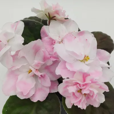 (LiK Labirinty Duehi) Large white double stars with irregular pink mottling. Medium to dark green foliage. Standard.
