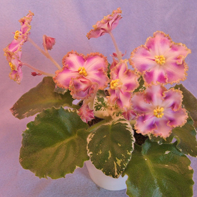 Mine is very similar to the picture, but with more verigation in the leaves and just a little lighter pink. Very pretty and unusual. Love the frilly flowers and color pattern. I really like this one and hope it continues to do well.