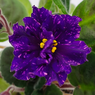 Dark blue double stars with white flecking in blooms. Dark green, quilted, foliage. Standard.