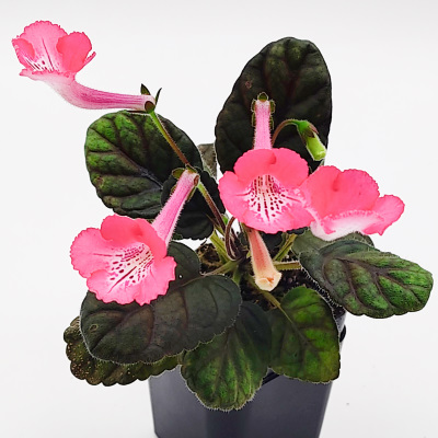 Bright carmine-pink blooms with rose dotting and lines on white throat. Medium green foliage. Miniature.