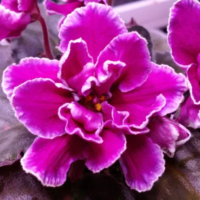 (PT Tsarskaia Osoba) Double purplish red stars with white edging. Dark green foliage. Standard.