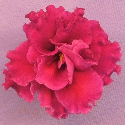 Fully double burgundy-wine frilled pansies with variable white tips. Medium dark green. Large standard. (Stork)