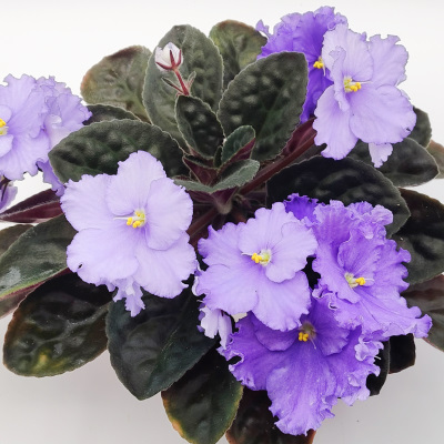 (RM Prozrachnyy Okean) Large semidouble medium blue stars. Medium green standard foliage.