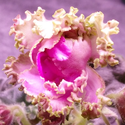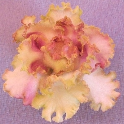 (RS Akropol) Sdbl. white to light pink stars with green ruffled edge, some pink markings. Medium green, ruffled, serrated, foliage. Standard. (Repkina)