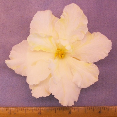 Huge double white stars mottled yellow. Medium green foliage. Standard. (Repkina)