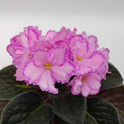 Had to give a shout-out to this variety, RS Mother’s Daughter. My plant is in its second bloom cycle right now and flush with huge, soft, sparkling lavender-pink blooms with crisp dark pink edging. The plant habit is vigorous. Just a really nice, solid violet!