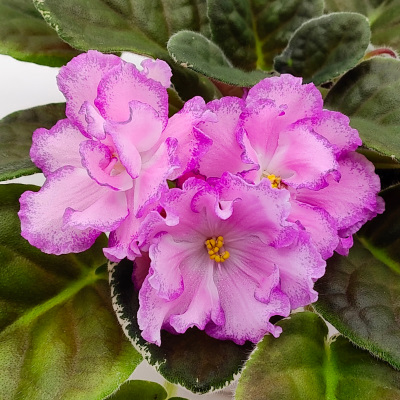 (RS Vzornaya Kresotka) Semidouble pink stars with white eye, variable raspberry ruffled edge. Medium green and white TL variegated foliage. Standard.
