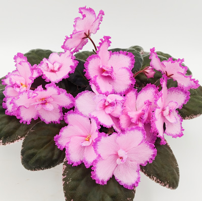 (RS Tropikana) Large sdbl. bright pink stars with dark red-purple frilled edges. Pointed, dark green and white TL variegated foliage. (Repkina)
