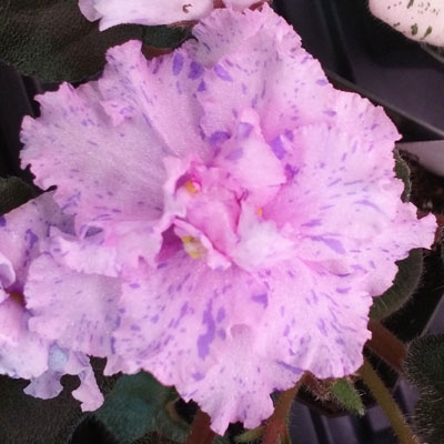Large sdbl. to double pink stars with blue fantasy streaks and flecks, lightly fringed. Quilted, serrated, foliage. Standard. AVSA #10926 (Sorano)