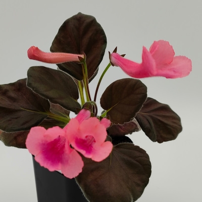 Beautiful salmon-orange blooms with deeper throat. Dark green foliage. One of our favorites.