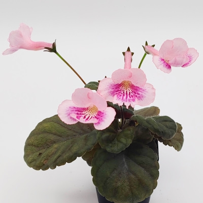 White to very pale pink tubular blooms spotted dark rose-pink along throat. Medium-dark green leaves.