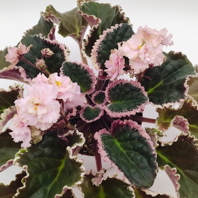 I have had this violet for several years and it keeps blooming beautifully. The white edges to the deep green leaves is beautiful, even when the plant is not blooming. The pink blossoms are delicate and the green tint at the edges of the blooms just enhances their beauty.