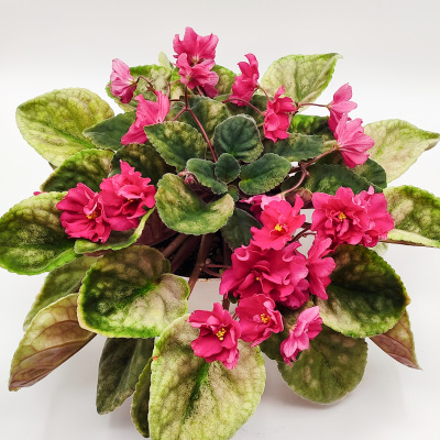 Double fluted ruby stars, pointed green and gold Champion variegated foliage. Standard. (Sport of Sagittarius Elite) (Lyon)