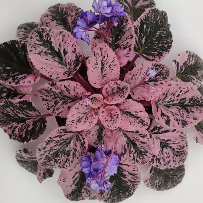 Trust the description and read it fully. This one is special. The foliage is variegated, and has pink in it. If you love the variegated, you will want this one. The blooms are wonderful, too. Very full and lush in a lavender blue, more blue than purple. A very sweet plant to add to your group. I'm getting another because these are so nice.