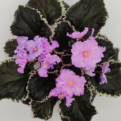 Semidouble light pink, fringed stars with blue fantasy flecks. Slightly wavy, dark green and white TL variegated foliage. Standard. A beautiful plant in every way! AVSA #11191 (Sorano)