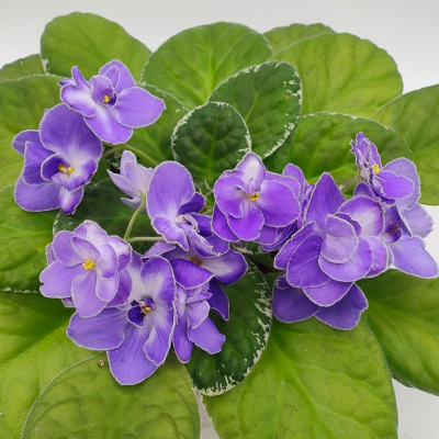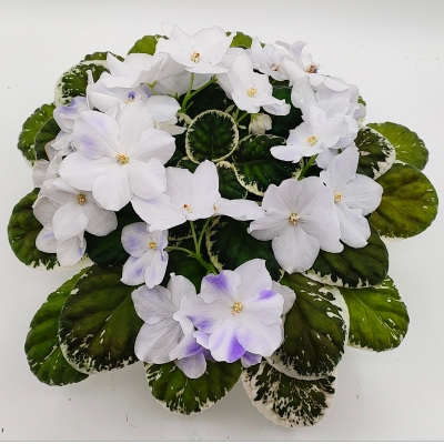 Semidouble white stars with random with purple patches. Green and cream TL variegated foliage. Standard. AVSA #10939 (Thibodeaux) Note: variable, it may be predominately white or purple.