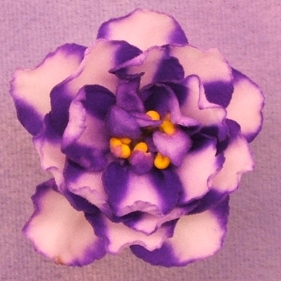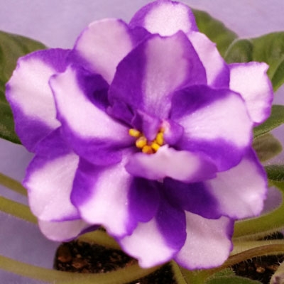 Wow! Very striking, large double white stars with blue side pinwheel stripes. Light to medium green, quilted foliage. Standard chimera.