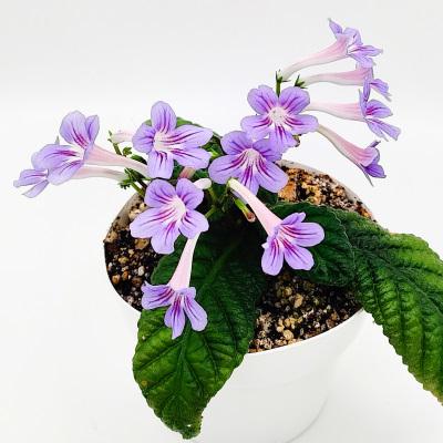 Adorable miniature variety with lots of blue trumpet blooms, with darker veining, white throat. Medium green, flat growing foliage. Wonderful little plant. (Martens)