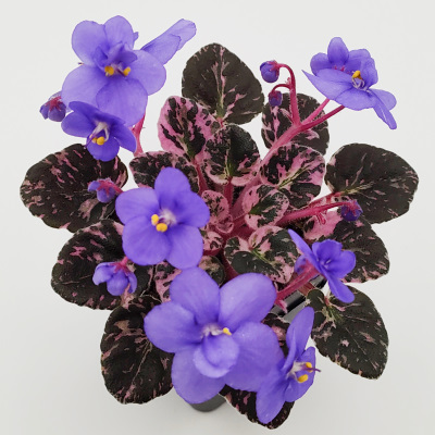 Double light blue pansies, TL variegated, green and white foliage. Semiminiature. (Hobbs)
