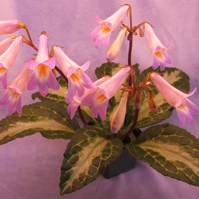 Pale blue trumpet blooms above beautiful dark green foliage with broad, bright cream, leaf centers. (Shalit)