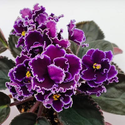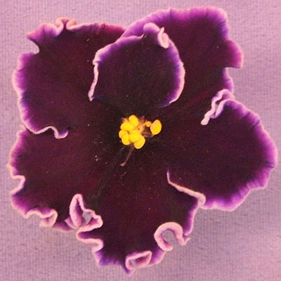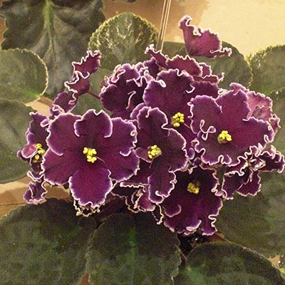 One of my first violets Very beautiful dark purple flowers with a white edge. The leaves are also pretty, dark green with lighter green veins. Stunning in person. Mine has just started blooming.