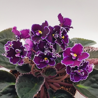 This is my first less than perfect reviews on AV I bought from Violet Barn. It has been about 6 months since I received this plant. The size of the plant is tripled since then. It is about 3 times larger than other plants I received in that order. The leaves are all up, no matter what I do. It is on the sunniest spot on my east side bay window. All other rosettes stay neat and compact, but this one looks quite ragged. The variegation is subtle, narrow cream edge, mostly on the young leaves. The flowers are gorgeous. They opened almost black, the edge is very contrast. After a couple of weeks, the color of the flowers washes down to purple. This is another disappointment. Overall, if you are OK with a huge rosette and leaves and not so good shape of the entire plant, you will probably pleased. I have limited space and I will not keep this variety despite the gorgeous flowers.