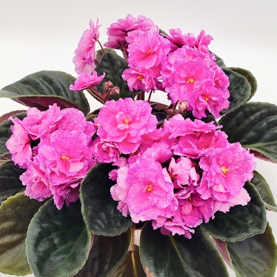 Semidouble, ruffled, medium pink stars with blue fantasy markings. Medium green, quilted, serrated, foliage. Standard. AVSA #7574 (Sorano)