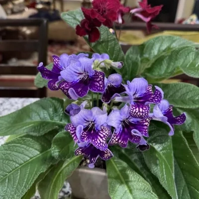 I am in love with this Steptocarpus. It is a strong plant and an easy grower. The blooms are large and beautiful. I bought this plant a year ago and it started blooming last fall. I kind off neglected to water it once and it got very dry and limpy. It didn't recover even after a good watering and I thought I was loosing the plant. I trimmed some leaves and buds and gave it a good liquid feed. It recovered slowly but to my surprise it has become stronger and has beautiful dark green leaves now. The plant is quite flat and the bloom stalks are talk. Harlequin lace is an apt name for this plant as the flowers speaks of its trueness to color and pattern.