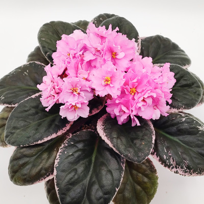 Semidouble to double medium dark pink frilled star. Dark green and cream TL variegated, serrated, foliage. Standard. AVSA #11216 (Muzalewski)