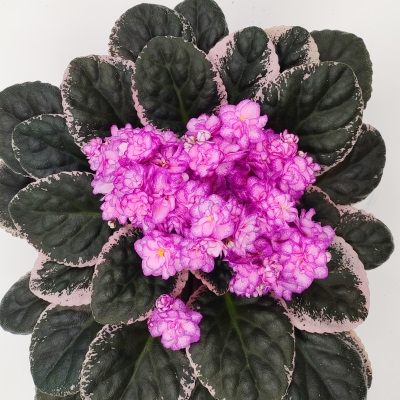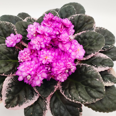 Double pink pansies with raspberry sparkle edging. Dark green and cream, quilted, serrated TL variegated folaige. Standard. (Muzalewski)