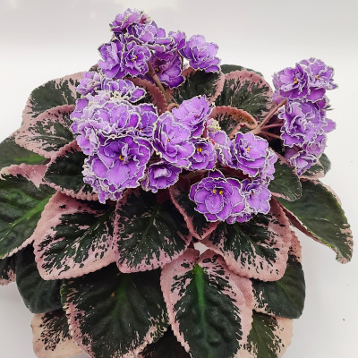 Large, semidouble wavy lavender pansies with purple band, white edge. Ruffled, dark green and cream TL variegated foliage. Standard. AVSA #11229 (Muzalewski)