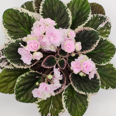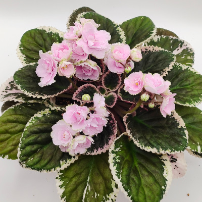 Semidouble lavender pink blooms edged white. Dark green and cream, ruflled, TL variegated foliage. Standard. (Muzalewski)
