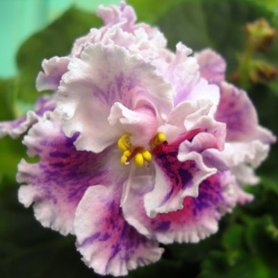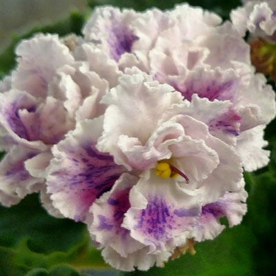 Sdlb. to double white pansies with pink patches and purple fantasy, occasional red streaks. Medium green, wavy, serrated foliage. Standard. (Hajner) Photos provided by hybridizer.