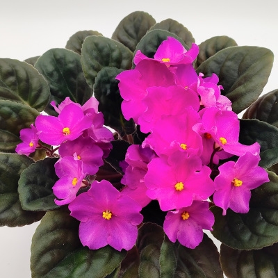 Single to sdbl. fluted fuchsia star with variable banding, lighter rays. Dark green, pointed, red-backed foliage. Standard. AVSA #10872 (Degner)