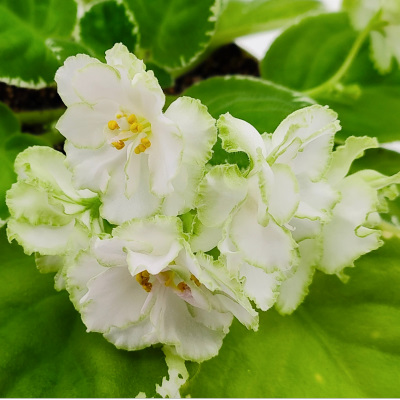 LE Beryl Frost is one of my first Russian AV and to this day it ranks as one of my favorites. I find it very easy to propagate this plant and have given several Beryl Frost babies to many appreciative friends. The foliage is striking for its white variegation and symmetrical growth. And with little grooming I find it easy to keep a clean look with this one. Flowers would be about 1 - 1/2 inches in diameter, about 2-3 per stalk in my current set up. The crisp white petals with the green margins nicely reflect the colors of the variegated leaves as well. Great plant for beginners!