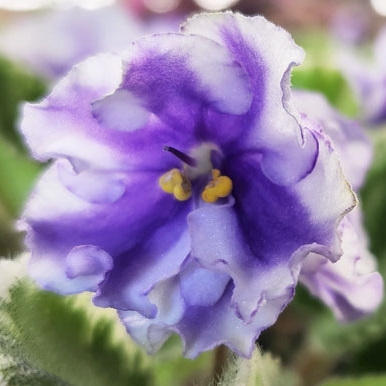 I picked this plant randomly without a picture and am so glad I did. The leaves are gorgeous and ruffled with variegated edging and the blooms are doubled and ruffled with purple and white. The edges of the bloom are a light green. Simply beautiful!