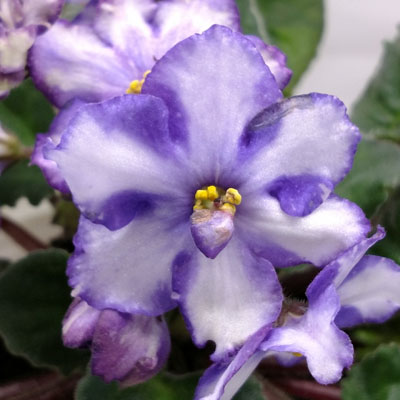 White semidouble stars with feathery blue side stripes. Medium green, serrated, foliage. Standard chimera.